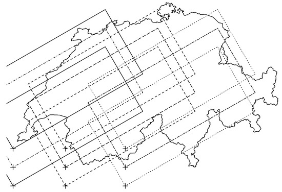In Switzerland the country-level return interval for severe storm events was estimated to 15 years [26], with a mean affected area of approximately 20,000 km2 that typically is restricted to Northern Switzerland and the Alps [23]. Hence, the default return interval in MASSIMO is set to 15 years and the extent of simulated storm tracks are rectangles of 200 by 100 km that are tilted by 30° and, thus, account for the prevailing west-southwestern wind direction (Figure 2). The location (easting and northing) of the storm tracks is determined by randomly selecting from nine possible southwestern corners. This results in storms being most frequently simulated in the Bernese Pre-Alps, which corresponds to storm hazard maps based on historic data [26]. The proportion of sample plots that experience damages and the severity of damage (% of killed trees) are based on observations of the three most severe past storm events (a series of storms in February 1967, Vivian in 1990 and Lothar in 1999). These storm events are distinguished with three relative storm severity levels (0.1, 0.6, 1) that are simulated with equal probability of occurrence. To simulate possible storm scenarios, e.g., under climate change, the return interval can be varied.