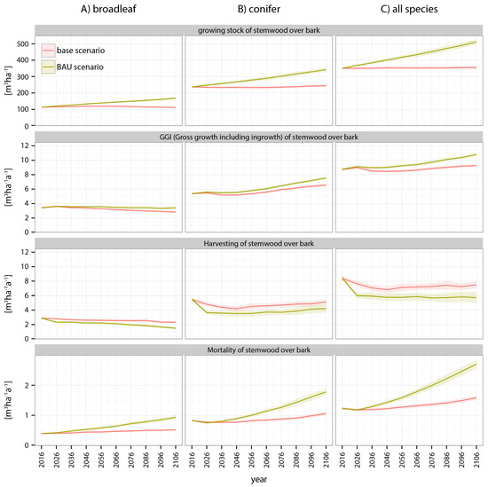 Development of growing stock, GGI, harvesting and mortality at national level under a base and a business as usual (BAU) scenario. (A) shows broadleaves, (B) shows conifers and (C) shows all species together. The shaded areas represent the standard error of the mean.