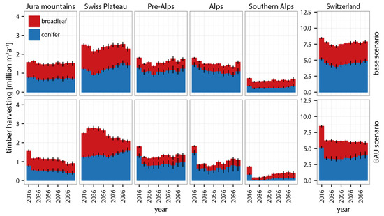 Harvesting of merchantable wood (stem and branch volume with minimal diameter > 7 cm without bark) for production regions of Switzerland under the base and business as usual (BAU) scenarios. Error bars represent the standard error of the mean.