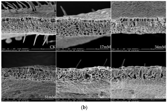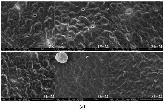 | Treatment (mM) | Stomatal Density (number mm−2) | Stomatal Length (μm) | Stomatal Width (μm) | Leaf Thickness (μm) | Palisade Tissue Thickness (μm) | Palisade Tissue Thickness/Leaf Thickness (%) |