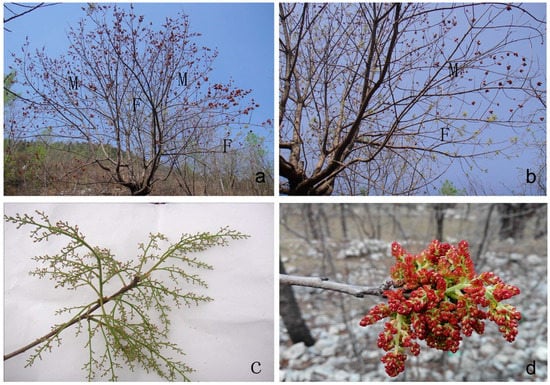 Characteristics of the selected monoecious Pistacia chinensis. Female and male branches of the selected tree (a,b, respectively); female inflorescences (c); and male inflorescences (d).
