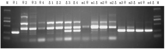 All of the specific DNA fragments of different sex types or individuals were individually recovered from agarose gel and purified using a QIAquick Gel Extraction Kit (Aidlab Biotech, Beijing, China). The PCR products were cloned into the pMD19-T vector (Takara, Dalian, China) and then sequenced (Beijing Genome Institute, Beijing, China). Based on the sequences obtained, 16 primer pairs (Table 2) were designed by the Primer Premier 5.0 software and used to re-amplify the same DNA samples. The PCR reactions with the SCAR markers were carried out in a final volume of 25 μL, containing 50 ng of genomic DNA, 10 pmol of each primer, 2 μL dNTPs (2.5 mM each), 2.5 μL 10× PCR buffer (100 mM Tris-HCl, pH 8.3, 500 mM KCl, and 15 mM MgCl2) and 0.5 U Taq polymerase (Takara, Dalian, China). Amplification conditions were one cycle at 94 °C for 3 min, followed by 32 cycles at 94 °C for 30 s, 51–61 °C (based on the melting temperatures of the primers) for 30 s, and 72 °C for 25–40 s (based on the predicted sequence length). The electrophoresis and observation protocols were the same as described above. The experiments were replicated three times.