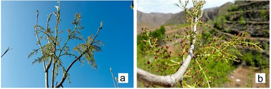 - İsfendiyaroğlu, M. Hermaphroditism in Pistacia atlantica Desf.: A New Report from Izmir/Turkey. Ege Univ. Ziraat Fak. Derg. 2007, 44, 1–12. [Google Scholar]