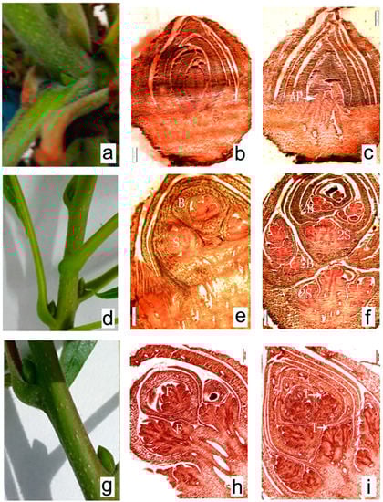 In the initial differentiation phase, the differentiation processes of male and female flower buds were similar. Using paraffin sections, it was impossible to distinguish any reproductive structures on the developing inflorescences. To begin, an apical point appeared from the lower area of the bud and slowly grew upwards (Figure 4c). During this period, flower buds were green and thin, slightly bigger than leaf buds, and had tightly closed bud bracts (Figure 4d). Then, the bract differentiation phase started, and a shoulder formed inside each bract (Figure 4e). After that, based on the shoulder, the secondary primordium of the shoulder arose (Figure 4f), and corresponding secondary bracts gradually formed outside each secondary shoulder. As the new shoot’s growth became more rapid, the buds became larger (Figure 4g). At the same time, secondary bracts continued growing as the secondary shoulders gradually formed and floret primordia emerged (Figure 4h). Next, the periphery of the floret primordium gave rise to several bulges, entering the tepal differentiation phase (Figure 4i).