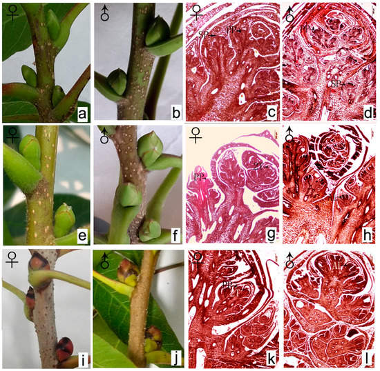 After the bisexual structures developed into unisexual organs, the outside bracts became brown and leathery (Figure 5i,j). The bud shapes of both sexes were basically stable but kept expanding. As the secondary tepal differentiation of the female flowers was completed after June 29, the pistil primordia gradually became plump (Figure 5k). Conversely, the anther-like structures in the male buds became bigger and fuller (Figure 5l), with the male buds constantly expanding, which resulted in the male buds being significantly bigger than the female buds.