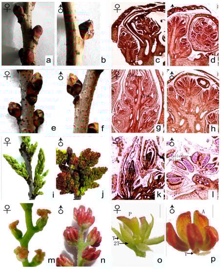 To determine the morphological and physiological changes that occurred in male and female shoots throughout the year, external phenological and internal development phases were observed from April 2015 to April 2016. As can be seen in Table 4, the female flowers bloomed later, while the female shoots grew earlier than those of the male. With the new shoot growth and spreading of leaves, leaf buds developed into flower buds. In the initial differentiation phase, flower buds were slightly bigger than the leaf buds. In the late stage of sex differentiation, flower buds were significantly larger than leaf buds, and the differences between male and female buds were visible. Additionally, the bracts turned brown and leathery. In the late phase of sex differentiation, flower buds grew slowly or aborted, while the fruit developed until maturity in October. Finally, sex organs and gametophytes started to develop in the second year after breaking dormancy [].
