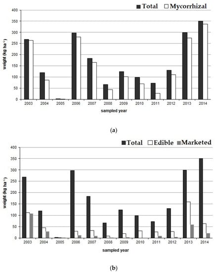 (a) Average total and mycorrhizal fresh weight (kg ha−1) production by sampled year. (b) Average total, edible and marketed fresh weight (kg ha−1) production by sampled year.