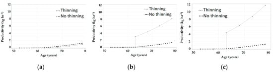 Total mushroom productivity with no thinning and with thinning activities corresponding to G10 (a), G25 (b), G35 (c) silvicultural scenarios.