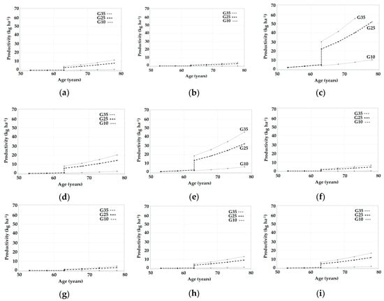 The effect of thinning intensity was evaluated in different climatic scenarios (Figure 3). Comparison of the three silvicultural scenarios (G10, G25, G35) in the c1, c2 and c3 climatic scenarios revealed that total mushroom productivity increased after thinning in G25 and G35 and also increased with thinning intensity (Figure 3a–c). The highest increment appeared in the climatic conditions of the c3 scenario (the highest precipitation with the hottest conditions) (Figure 3c).
