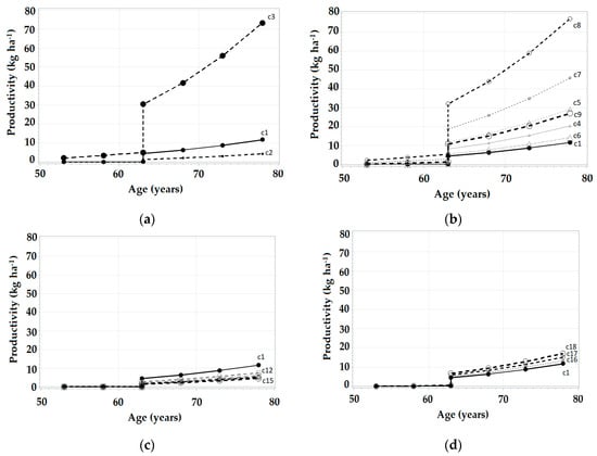 In contrast, comparison of the climatic scenarios within one silvicultural treatment, for instance G35, showed that the highest total mushroom productivity was obtained in wetter- and hotter-than-average conditions (Figure 4a,b). In drier scenarios, c12 showed the smallest decrease in production due to the effect of temperature and production was lowest in the driest conditions (Figure 4c). In hotter scenarios (Figure 4d), total mushroom productivity increased slightly with respect to the c1 scenario.