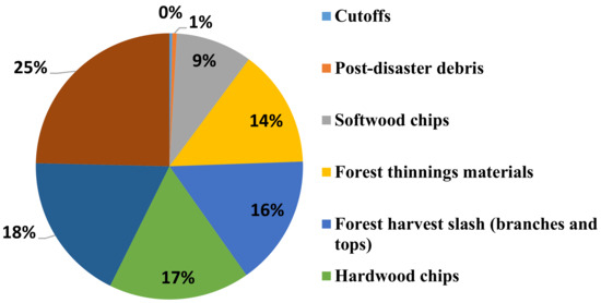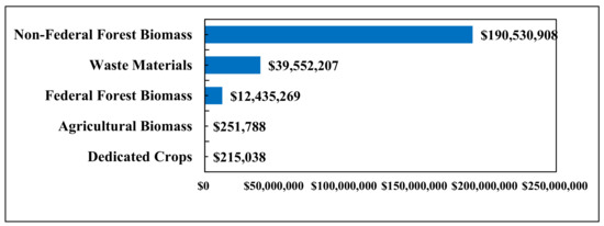 During 2009–2010, BCAP matching payments totaled $244 million. Around 78% ($190,530,908) of the budget was used for forestry biomass, while agricultural biomass only accounted for 0.13% (Figure 1) [4]. The high allocation to forestry biomass causes concerns regarding possible market competition between this bioenergy program and existing wood industries [4]. In 2010, some wood manufacturing industries that heavily depend on wood residues such as wood shavings, wood chips and sawdust, noticed an increase in price for their raw materials, after the release of the United States Department of Agriculture’s announcement of matching payments in 2009. This increase seemed to be linked to the BCAP program [5] since over 80% of matching payment goes for these forest residues (Figure 2). This program created an incentive for biomass owners to sell wood residues to biomass facilities rather than to manufacturers that use the same raw materials for products such as composite panels, particleboard, and fiberboard.