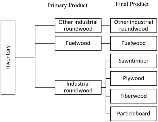 For each scenario, we focused on the price and production change of industrial roundwood, as industrial roundwood is the main raw material for other final forest productions (Figure 3). In addition, we assessed the welfare change for the whole forest product industry to examine if BCAP causes welfare loss for the forestry product market. For the matching payment scenario, we also examined the price and production change for particleboard as well as fuelwood to assess if BCAP negatively influences the manufacturing industries that intensively use wood residues.