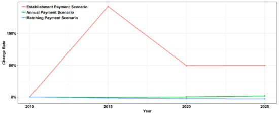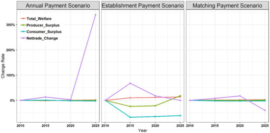 Under the annual payment scenario, the welfare change was also an inverse V-shape. From 2011 to 2015, there was a 1.4% decrease in forestry industrial welfare compared to the base-year scenario. However, in 2025, the final welfare increase reached 1.6%. The enhanced trade value was the main reason driving the increase in welfare. Both domestic producers and consumers suffered a loss from the annual payments. On the supply side, the biggest loser was the industrial roundwood producer. Due to the annual payments, the price of industrial roundwood fell at an annual rate of −1.1%, which directly decreased the producer surplus. The next two losers were woodpulp and paper, whose prices declined as well at rates of −0.3% and −0.1%, respectively. On the consumer side, the biggest loser was pulpwood, which suffered around −0.5% losses caused by the annual payments. Similar to the establishment payments, most benefits from the lower price brought by BCAP were transferred to the foreign consumer via export. From the trade aspect, the winners were still from woodpulp and paper exporters. Similar to the establishment payments, lower domestic prices enhanced the competitiveness of these two products and induced exports.