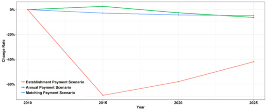 Given the rapid increase in production under the establishment payment, the price of industrial roundwood decreased greatly, at a rate of −69% in 2015 and −42% in 2025 compared to the base-year scenario (Figure 5). Under the matching payment scenario, the price reduced slightly with a decreasing rate ranging 2.8%–4.9%. We found that both the production and price of industrial roundwood decreased under the matching payment, which was mainly caused by the significant reduction in the particleboard production. The particleboard production reduction led to a weak demand for industrial roundwood, resulting in a decrease in industrial roundwood production. However, the decreasing rate of production could not catch up to the decreasing rate of demand, resulting in a price reduction as well. For the annual payment scenario, the price change was an inverse V-shape, with an increasing rate of 2.6% in 2015 but a decreasing rate of 6.3% at the end of the projection, which corresponds to the production change.