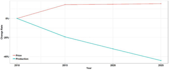 We set the exogenous shock in 2010 when BCAP was fully implemented. We then assessed the production and price changes for industrial roundwood, particleboard, and the welfare change for 2010–2025, with a timeline corresponding to the BCAP 15-year subsidy timeline [24].