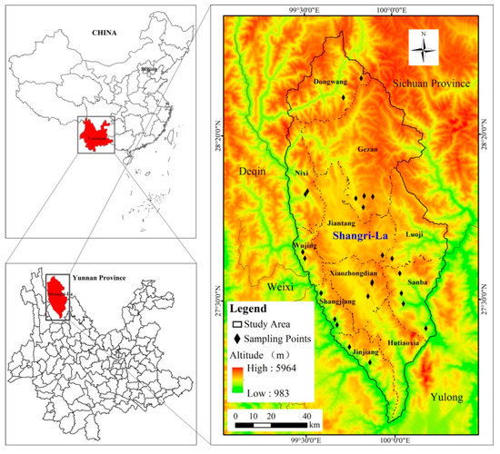 Shangri-La city is the capital of the Diqing Tibetan Autonomous Prefecture, Yunnan Province, China. It is located in the northwest of Yunnan Province, the eastern part of Diqing, between latitudes 26°52′ N–28°52′ N and longitudes 99°20′ E–100°19′ E (Figure 1). The study area, the average elevation is 3280 m and mountain area accounts for over 90%, is an important area for biodiversity conservation and water conservation for ecological protection in the alpine valleys of northwest Yunnan. The climate is alternately controlled by the southwest monsoon and the south branch of the westerly jet. The vertical zoning of the climate is obvious, the dry season (June to October) and wet season (November to next May) are distinct. The annual average precipitation is about 620 mm, the annual average temperature is about 6 °C. According to research by the Soil and Fertility Station of Yunnan Province (SFSY) and the Office of Soil Survey of Yunnan Province (OSSY), the soil parent materials in Shangri-La include plateau lake sediments, river sediments, flood deposits residual, etc., and the soil types include alpine frost desert soil, alpine shrubby meadow soil, brown coniferous forest soil, dark brown soil, subalpine meadow soil, brown soil, red soil, etc. [43]. The city’s forest coverage rate is more than 70% and the total area of four constructive species, Quercus aquifolioides (Quercus aquifolioides Rehd. et Wils.), Abies georgei (Abies georgei Orr), Alpine pine (Pinus densata Mast.), and Yunnan pine (Pinus yunnanensis Franch.), accounts for over 80% of the city’s arbor forests [44,45]. So, the above four kinds of forest soils were selected for research.