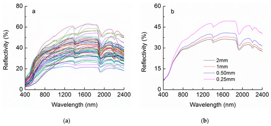 Spectral reflectance curves of soil: (a) 60 spectral reflectance curves of the total samples; (b) mean spectral reflectance curves of four particle sizes.
