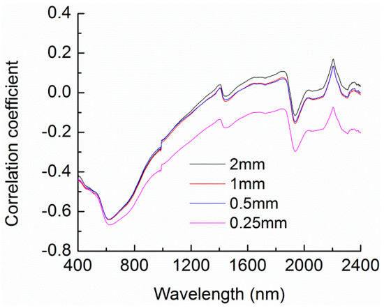 The average spectral reflectance of the four particle sizes was calculated, and the spectral reflectance curves were obtained (Figure 2). Generally, the spectral reflectance increased rapidly in the 400–800 nm range, while the change at 800–2400 nm was relatively stable. There were absorption valleys around 1400 nm, 1900 nm, and 2200 nm, which are generally considered to be caused by moisture [53]. The effect of particle size on the soil spectral reflectance was obvious, the smaller the soil particle size, the higher the reflectance and the more obvious were the spectral changes. The main reason was that with the decrease of particle size, the void between the soil particles decreased, which made the soil appear smoother, and the spectral reflection was enhanced. The spectral reflectance of the soil sample with 0.25 mm began to change significantly at around 580 nm, however, the spectral reflectance of soil samples with 2 mm, 1 mm, and 0.5 mm changed significantly around 800 nm.