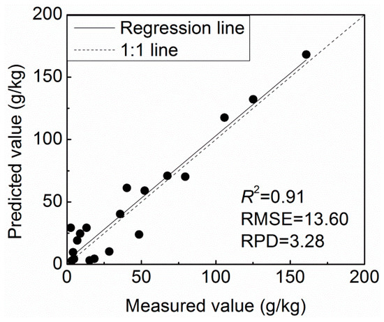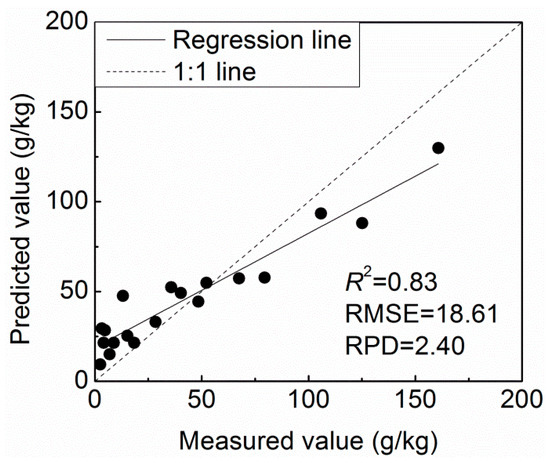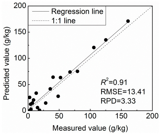 Comparison of estimated and measured values of SOM content by partial least squares regression (PLSR).