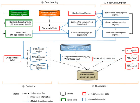Emissions from forest fires were estimated by multiplying total fuel consumption by emission factors of each compound (CO, PM2.5, and PM10) (Figure 1). As forest fires are categorized as surface and crown fires in the KFSDP system, emission factors were also required for each fire type with regard to CO, PM2.5, and PM10. The emission factors were derived for each pollutant compound based on the concentrations measured from combustion products using conifer and broadleaf fuels in the laboratory [36] and a carbon mass balance model [37]. First, combustion experiments were implemented to measure the concentrations of each compound for each type of fire. For surface fires, the dead leaves of P. densiflora and Quercus variabilis Blume, which are considered to be representative species of conifer and broadleaf fuels, were combusted to sample each compound. For crown fires, the dead leaves, live leaves, and branches of P. densiflora were burned to sample smoke compounds since crown fires mainly involved conifer fuels when surface and crown fires occurred at the same time (Table 2). Then, emission factors were estimated for each compound using a carbon mass balance technique (Table 2) wherein PM2.5 and PM10 were assumed to be composed of 60% carbon and the fuel carbon fraction was considered to be 50% [38]. Once the total fuel consumption of GIS grids was determined for forest fire areas at 30-min intervals in the fuel consumption module, the amounts of emission were automatically calculated for each smoke compound (CO, PM2.5, and PM10) based on emission factors supplied in the KFSDP system.