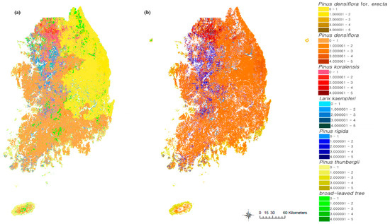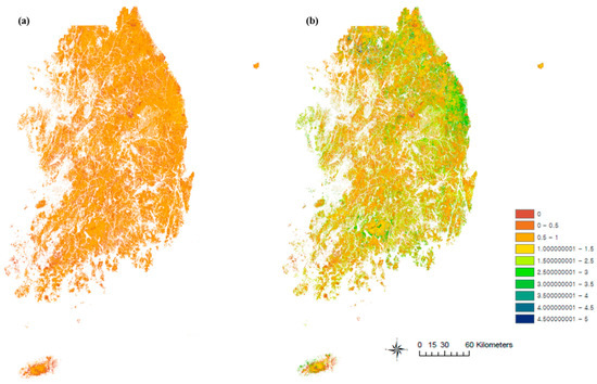 Distribution of (a) surface- and (b) crown-fire carrying fuels (kg/m2) in Korea.