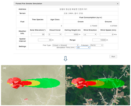 Graphical user interface (GUI) of Gaussian smoke dispersion model and smoke prediction output enabled by the Korean forest fire smoke dispersion prediction (KFSDP) framework. The forest fire was simulated in Jeongseon, Kwangwon-do, Korea simulated from 7:30 a.m. to 4:30 p.m. on April 11, 2018. Both fires and predicted dispersion of PM10 concentrations are shown. Users can animate the forecasts, zoom, pan, and map data in both (a) Keyhole Markup Language (KML) and (b) satellite layers. PM10 is coarse (<10 µm) particulate matter.