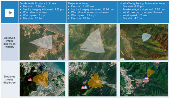 Comparison of smoke dispersion predictions with observed surface smoke plumes from real forest fires in Korea.