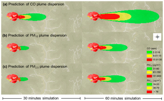 Predicted dispersions of (a) CO, (b) PM10, and (c) PM2.5 plume concentration contours after 30 min and 60 min of smoke simulations. Both fires and predicted CO, PM10, and PM2.5 surface concentrations are shown. PM2.5 and PM10 are fine (<2.5 µm) and coarse (<10 µm) particulate matter, respectively.