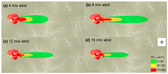 Comparison of the effects of wind speeds on predicted dispersions of PM10 plume concentration contours: (a) 4 m/s winds, (b) 8 m/s winds, (c) 12 m/s winds, and (d) 16 m/s winds. Both fires and predicted PM10 surface concentrations are shown. PM10 is coarse (<10 µm) particulate matter.