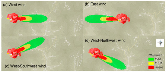 Comparison of the effects of wind directions on predicted dispersions of PM10 plume concentration contours: (a) west winds, (b) east winds, (c) west-southwest winds, and (d) west-northwest winds. Both fires and predicted PM10 surface concentrations are shown. PM10 is coarse (<10 µm) particulate matter.