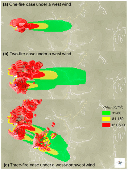Effects of multiple fires on predicted dispersions of PM10 plume concentration contours: (a) one-fire scenario under a west wind, (b) two-fire scenario under a west wind, and (c) three-fire case under a west-northwest wind. Both fires and predicted PM10 surface concentrations are shown. PM10 is coarse (<10 µm) particulate matter.
