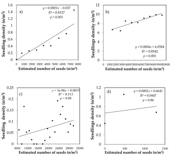 The relationship between the number of fallen seeds and the number of seedlings of each species was determined using simple linear regression for each stand type. Here and in all subsequent analyses where it was required, normality was verified using the Shapiro–Wilk test (p > 0.05) [33] while homoscedasticity and independence of residuals were assessed by comparing the residuals plotted to the predicted values.