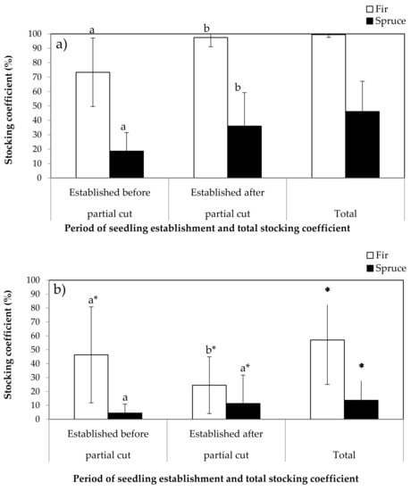 Stocking coefficient (± standard deviation) of fir (white bar) and spruce (black bar) seedlings before and after partial cut, and total stocking coefficient per species for natural stands (a) and plantations (b) (generalized linear mixed models (glmm)). Lower-case letters indicate a significant difference (p < 0.05) before and after partial cut for a given species in a stand type, while asterisks indicate a significant difference (p < 0.05) between stand types for a given species and period and for total stocking coefficient.