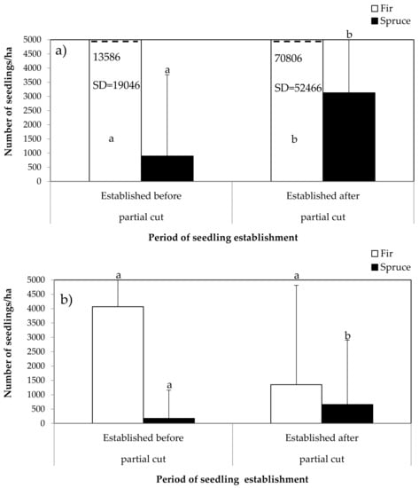 Seedlings density (± standard deviation (SD)) of fir and spruce before and after partial cut for natural stands (a) and plantations (b) (generalized linear mixed models). Lower-case letters indicate a significant difference (p < 0.05) before vs after partial cut for a given species in each stand type.