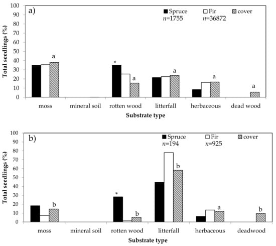 Percentage of total seedlings associated with each substrate type and percentage of cover per substrate for natural stands (a) and plantations (b). An asterisk indicates a significant difference (p < 0.05) between a substrate cover and the proportion of seedlings found on this substrate for each species (Pearson chi-square-test). Lower-case letters indicate a significant difference (p < 0.05) in substrate cover between stand types (Pearson chi-square test).