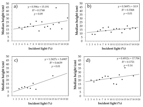 Relationship between median height of spruce and fir seedlings established after the partial cut and the percentage of incident light measured at 60 cm from the ground in natural stands (spruce (a) and fir (b)) and plantations (spruce (c) and fir (d)). n = 858 for fir in naturals stands, n = 243 for fir in plantations, n = 428 for spruce in natural stands, n = 76 for spruce in plantations in a total of 1700 subunits of 4 m2.