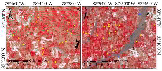Ground LAI plot locations shown as yellow triangles over Landsat 8 OLI imagery displayed with the color-infrared band combination NIR, Red, Green as RGB. The Virginia site is on the top left (A) over a 16/34 OLI image from 14 March 2014 and the Alabama site is on the top right (B) over a 21/37 OLI image from 13 February 2014. (C) shows the study site locations within Virginia and Alabama, U.S. and Landsat path/rows used.
