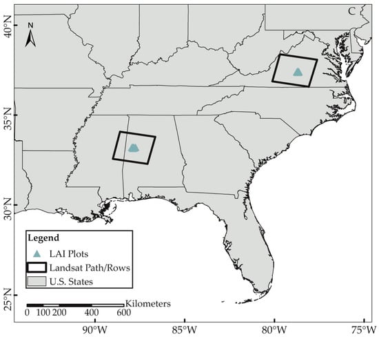 Modern forestry thus requires satellite-derived LAI [1,2], but as noted by Gao et al. 2014 [11], the coarse scale of available satellite derived LAI estimates from the Moderate Resolution Imaging Spectroradiometer (MODIS) is not adequate for stand-scale analyses since most pine plantations in the southern U.S. contain very few or no homogeneous MODIS pixels. The promise and potential of LAI estimation in monospecific pine plantations using Landsat data was noted by Vogel et al. [12]. Thus, there is both strong potential and extant need for LAI estimates from medium resolution sensors for use in forest management.