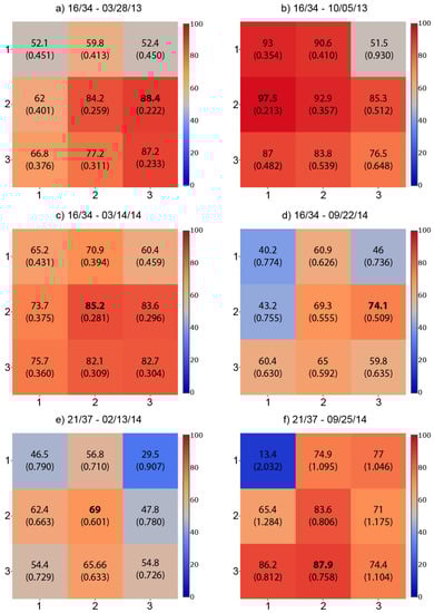 The 16/34 image acquired on 14 March 2014 (Figure 2c) and 21/37 image acquired on 13 February 2014 (Figure 2e) resulted in the best LAI regression model with the plot center pixel (Figure 2). There was not a consistent trend in terms of which adjacent pixel resulted in the most accurate LAI model with the four other images (Figure 2a,b,d,f). In every instance, at least one of the adjacent pixels to the plot centers resulted in models that explained significantly less of the variability within the ground measurements (Figure 2). Accurate plot and pixel locations are clearly a critical component of model development with any combination of ground and remotely-sensed measurements.