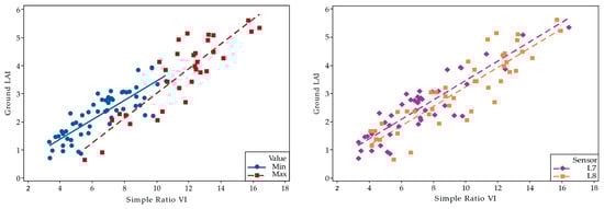 Regression models with closest in time imagery regardless of sensor and all ground data from both minimum and maximum LAI. The blue circles are the minimum LAI and the red triangles are the maximum LAI data points. The different sensor data points are differentiated by purple diamonds (ETM+) and orange squares (OLI).