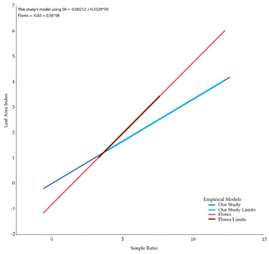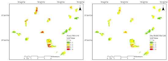 Minimum LAI shown for both the Flores et al. [15] model (left) and our combined model using SR (right).