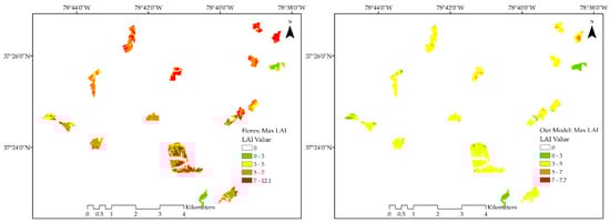 To assess whether our updated model has potential to replace the one in common operational use, we mapped LAI with our updated combined SR model and with the model presented by Flores et al., commonly used for pine silviculture decision support in the U.S. South (Equation (7)) [15].
