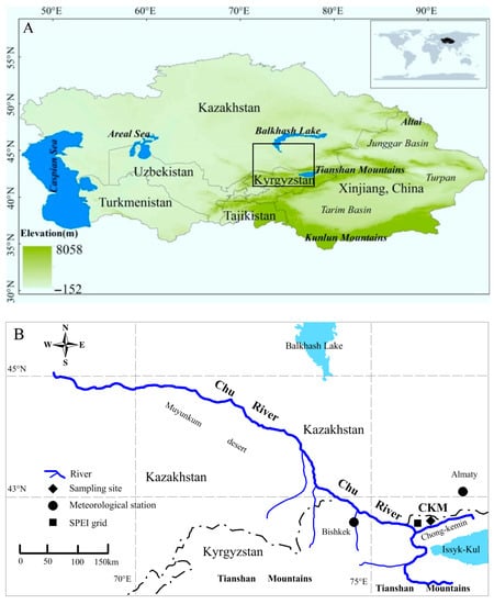 It is widely recognized that global warming has occurred since the mid-19th century [1]. However, corresponding hydroclimatic changes demonstrate significant regional variations [2]. Arid Central Asia (ACA) covers 5 × 106 km2, and includes Kazakhstan, Kyrgyzstan, Tajikistan, Turkmenistan, Uzbekistan, and Xinjiang in northwest China. Drought is a major climate disaster in ACA and the cause of considerable agricultural, economic and environmental damage. The Tianshan Mountains, which extend across the region, are known as the “water towers” of Central Asia, and are the largest and most important mountain system in ACA. The region is especially sensitive to climate change [3,4]. Obvious warming in the Tianshan Mountains has been detected at a rate of 0.3 °C/10 years [5], and persistent warming is exacerbating droughts and water shortages. The Chu River, which originates in the Tianshan Mountains, is one of the longest rivers in ACA. Its river basin is shared by Kyrgyzstan (where the river originates) and Kazakhstan, and its waters feed millions of people and support the social development and economic prosperity of both countries. Hence, it is particularly important to understand long-term hydroclimatic changes in the Chu River Basin. However, the sparse and unevenly distributed meteorological and hydrological stations in the region provide limited data for understanding the region’s climate and water resource variations [6]. As proxy data is also limited, long-term climate change research for the region is lacking. However, Schrenk spruce (Picea schrenkiana Fisch. et Mey.) is distributed throughout the Tianshan Mountains, and its radial growth is an ideal proxy for past climate change [7].