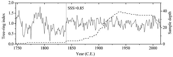 Following standard dendrochronological methods, all tree-ring cores were brought to the Key Laboratory of Tree-ring Physical and Chemical Research of China Meteorological Administration, dried naturally, mounted, and sanded with progressively finer grains sizes until the ring structures were clear. The samples were then cross-dated with skeleton plots and measured with 0.001 mm precision using a Velmex measuring system [12]. The quality of the cross-dating was checked with the COFECHA program [13] to ensure exact dating. We developed a site chronology using established standardisation techniques with the program ARSTAN [14]. We chose the negative exponential curve (NEC) method to de-trend the growth trend. We used a subsample signal strength (SSS) of 0.85 as an appropriate cut-off criterion for climate reconstructions [15] (Figure 2). The SSS is a measure of decreasing predictive power of transfer functions due to reductions in the sample size of underlying tree-ring series back in time [16].