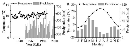 Annual (A) and monthly (B) changes in mean temperature (1925–1988) and total precipitation (1950–2000) at the Frunze meteorological station.