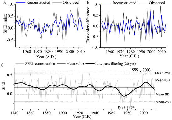 A leave-one-out cross-validation test indicated that the regression model passed all verification tests (Table 1). We also verified the reliability and stability of the model using split-sample calibration-verification tests. The explained variances are relatively high during the two calibration periods. All of the correlation coefficient (r), first order difference correlation (rd), explained variance (R2), F-test (F), product mean test (t), sign test (ST) and first order difference sign test (ST1) achieved or surpassed the 95% significance level. The reduction of error (RE) and coefficient of efficiency (CE) which are particularly rigorous indicators of reconstructed reliability, were both positive, suggest that the linear regression equation was statistically validated. Finally, we compared the first differences with the SPEI grid and obtained a correlation coefficient of 0.514 (p < 0.001, n = 63) (Figure 4B). This indicates that there is good consistency in the high frequency changes between the reconstruction and the observed. Equation (1) was therefore used successfully to reconstruct SPEI from the previous July to current June in the Chu River Basin for the period 1840–2014 (Figure 4C).