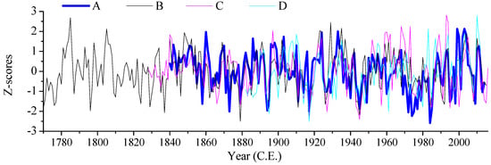 Comparison of SPEI reconstruction from this study and other studies in the western Tianshan Mountains. (A) Reconstructed SPEI in Chu River Basin (this study); (B) Reconstructed precipitation in southern Kazakhstan [9]; (C) Reconstructed PDSI in Dzungarian Alatau [10]; (D) Reconstructed precipitation in Issyk-Kul, Kyrgyzstan [7].