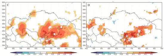 We compared the consistency of the SPEI reconstruction with other studies in the western Tianshan Mountains (Figure 5) and found that past moisture changes in the region are very consistent. The correlation coefficient between the SPEI reconstruction and southern Kazakhstan [9], Dzungarian Alatau [10], and Issyk Lake [7] are 0.596 (Pearson, n = 175, p < 0.0001), 0.482 (Pearson, n = 175, p < 0.0001), and 0.399 (Pearson, n = 131, p < 0.0001), respectively. These strong correlations confirm that the SPEI reconstruction is reliable. To determine the spatial representation of the SPEI reconstruction, we analyzed its spatial correlation with the precipitation, SPEI, and scPDSI data from the CRU-TS grid datasets. The results showed that the SPEI reconstruction successfully represents the changes in climate over the whole of Central Asia during the past century, especially in Kyrgyzstan and southeast Kazakhstan (Figure 6).