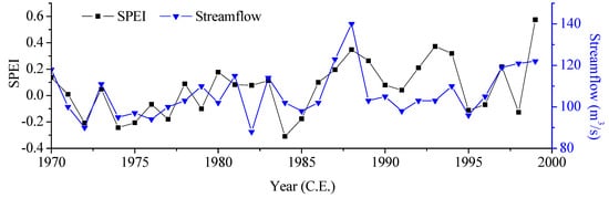 A comparison of the SPEI reconstruction and discharge variability of the Chu River indicates consistent long-term change (Figure 7). The correlation coefficient between the reconstruction and discharge is 0.540 (n = 30, p < 0.01) from 1970 to 1999. Discharge out of the Tianshan Mountains is strongly influenced by climate change because moisture mainly is supplied by atmospheric precipitation and snow melt. The SPEI reconstruction is therefore representative of the long-term trend in discharge.