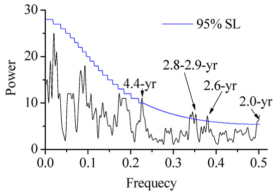 Strong inter-annual SPEI change was identified using the multi-taper method (MTM) [29]. There are significant 2.0-year, 2.6-year, 2.8–2.9-year and 4.4-year periods in the Chu River Basin (Figure 8). These periods suggest that the moisture of the Chu River Basin originates from the westerly circulation. In particular, a study suggested the 2–3-year period is linked to variations in the westerly circulation in the mid troposphere [30]. Other studies have found that the 2–3-year period characterizes precipitation or drought change in arid Central Asia [31,32,33], and suggest that the periodicity may be related to the tropospheric biennial oscillation (TBO) [34]. Because the upper stream westerly plays an important role in moisture variations in arid Central Asia by influencing the transport of water, the TBO signal is likely related to variations of the westerly.
